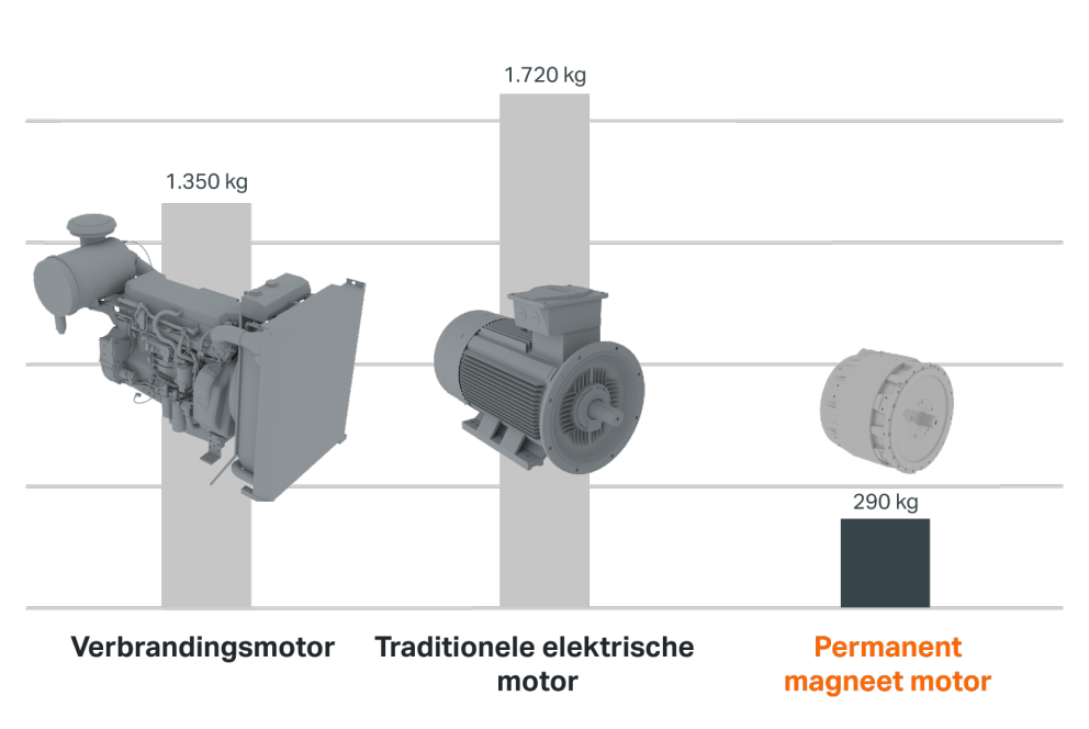 Elektromotoren hebben een snelle ontwikkeling doorgemaakt als het gaat om vermogensdichtheid. Als we een veelvoorkomende verbrandingsmotor en traditionele elektrische motor vergelijken met de eQuip permanent magneet motor, dan zien we dat er een groot verschil is. De permanent magneet motor is namelijk aanzienlijk lichter dan de verbrandingsmotor en de traditionele elektrische motor.