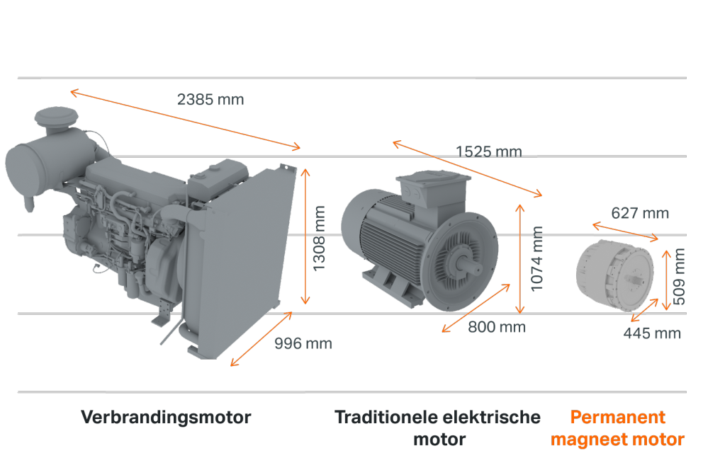 Permanent magneet motoren hebben significant kleinere afmetingen dan verbrandingsmotoren en traditionele elektrische motoren met hetzelfde vermogen. eQuips permanent magneet motor is 95% kleiner dan een verbrandingsmotor, en 55% kleiner dan een traditionele elektrische motor. Een stuk compacter, met hetzelfde vermogen.